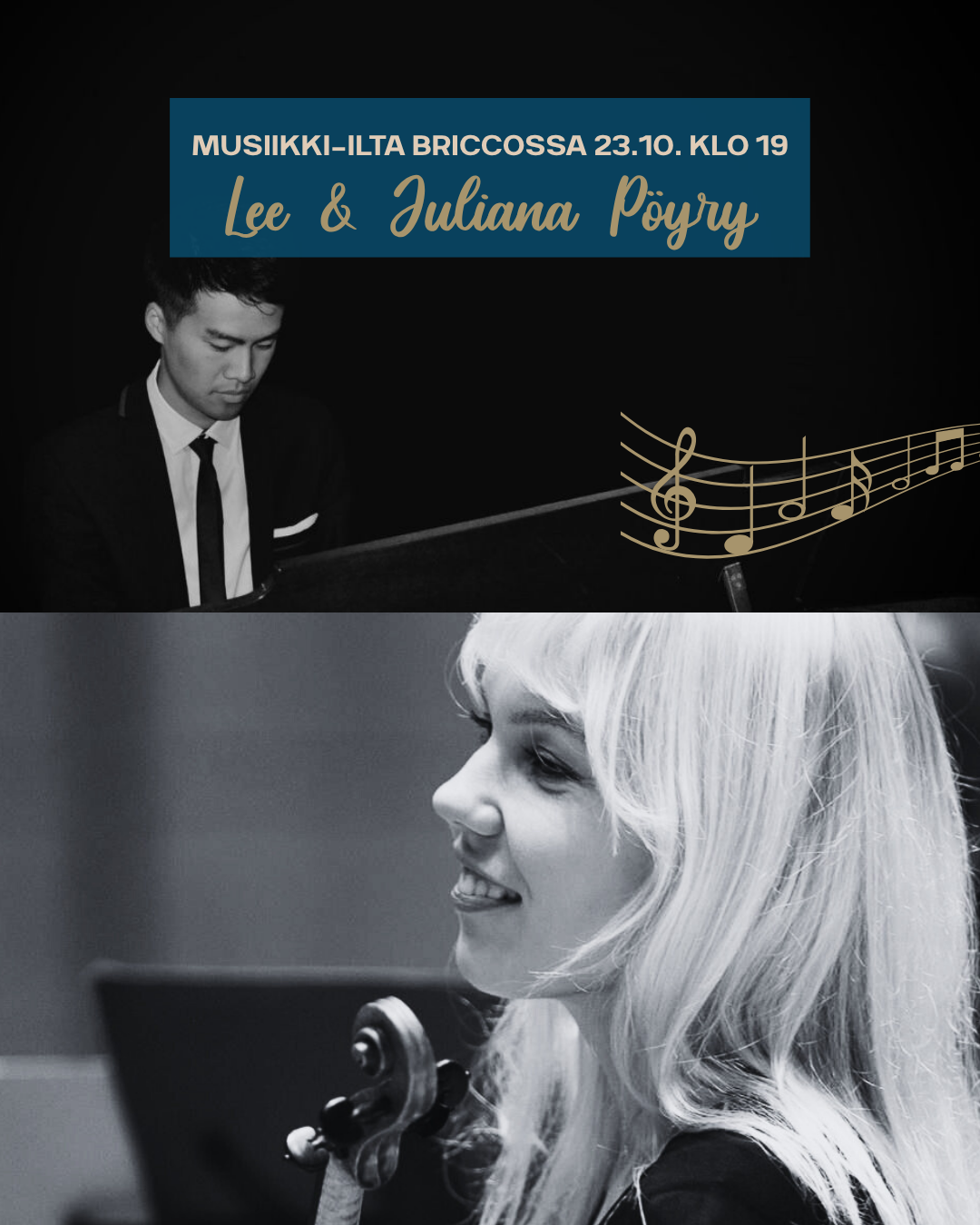 Tervetuloa viettämään tunnelmista musiikki-iltaa Briccoon. Torstaina 23.10. klo 19.00 esiintyvät pianisti Lee ja viulisti Juliana Pöyry.